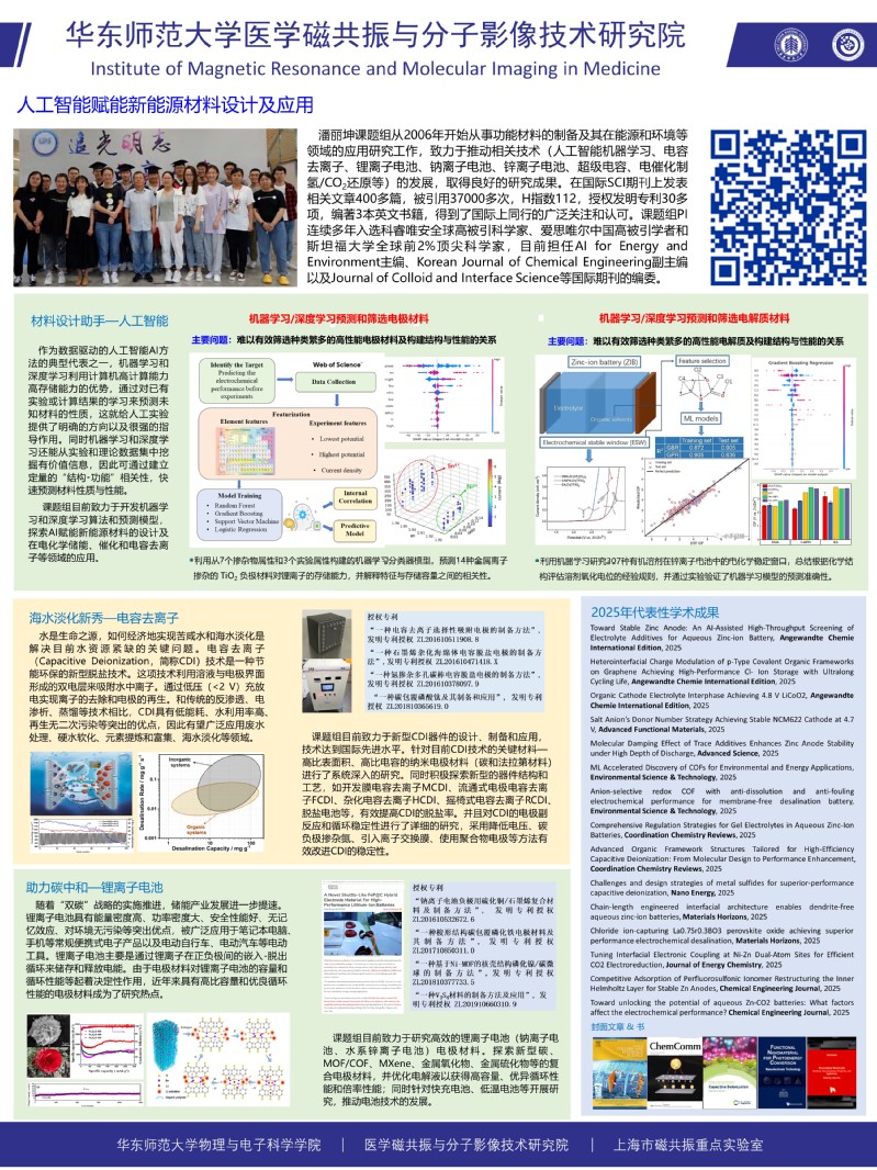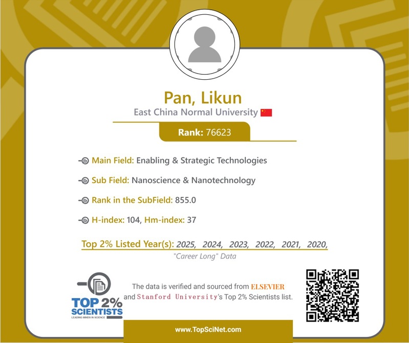 开授课程本科生课程:无机化学;大学物理;材料创新研究;现代水处理技术;电化学能源存储材料; 研究生课程:功能材料与表征;纳米电子材料与器件;科技论文写作和文献检索;人工智能材料应用 科研项目作为负责人主持了国家自然科学基金面上项目、上海市基础研究重点项目、上海市自然科学基金、上海市纳米专项、上海市应用材料研究与发展基金、上海市国内科技合作项目和上海市浦江人才计划等多个项目。 学术成果已在国际期刊上发表SCI论文400余篇(40多篇入选ESI高被引论文),H指数112,被引用37000多次(谷歌学术)。主编3本英文著作。授权了中国发明专利30多项。 书/章节 - Xingtao Xu, Likun Pan (ed.), 2023. Capacitive Deionization, Royal Society of Chemistry. -Likun Pan, Guang Zhu (ed.), 2016. Perovskite Materials - Synthesis, Characterisation, Properties, and Applications, IntechOpen. -Likun Pan, Xinjuan Liu, Guang Zhu (ed.), 2020. Functional Nanomaterial for Photoenergy Conversion, World Scientific. -Xinjuan Liu, Likun Pan, Chang Q. Sun, Chapter 10 Microwave-assisted synthesis of semiconductor nanomaterials for energy conversion, In Erwann Guenin (ed.), 2017. Microwave Engineering of Materials: From Mesoscale to Nanoscale, Pan Stanford Publishing Pte. Ltd. -Xingtao Xu, Junfeng Li, Yuquan Li, Bing Ni, Xinjuan Liu, Likun Pan, Chapter 4 Selection of carbon electrode materials, In Silvia Ahualli, Ángel V. Delgado (ed.), 2018. Charge and Energy Storage in Electrical Double Layers , Academic Press (Elsevier) 代表性论文 (全部论文请见ResearchGate或课题组网页) - K. Han, J. F. Li, Z. S. Zhang, C. L. Wang*, J. B. Li*, Y. Zhu, Z. J. Zhu, X. J. Liu, G. Yang, L. K. Pan*, Chemical Engineering Journal DOI: 10.1016/j.cej.2025.170251, Rapidly Evaluating Electrochemical Performance of Transition Metal Disulfides for Lithium Ion Batteries Using Machine Learning Classifier - Y. Q. Li, Z. H. Bian, C. L. Wang, Q. Y. Hong, H. Wang, H. Y. Han, T. Liu, J. Y. Hu*, L. K. Pan*, X. Z. Wang*, Environmental Science & Technology DOI: 10.1021/acs.est.5c12787, Anion-selective redox COF with anti-dissolution and anti-fouling electrochemical performance for membrane-free desalination battery - H. Wang, Y. Zhu, J. F. Li, Y. Q. Li, Y. Liu*, X. T. Xu*, Z. Q. Chen, X. J. Liu, L. K. Pan*, Coordination Chemistry Reviews 546, 217084 (2026), Advanced Organic Framework Structures Tailored for High-Efficiency Capacitive Deionization: From Molecular Design to Performance Enhancement - X. F. Shu, S. C. Yan, Y. Liu, F. F. Min, B. Fang*, L. K. Pan*, Chemical Engineering Journal 524, 169345 (2025), Doping-Engineered Fermi Level Modulation in MXenes: Multiphysics Field Coupling Enabled Electron-Pathway Design for Electromagnetic Optimization - Y. Li, Y. J. Zhang*, H. Y. Zhao, J. F. Li, H. Xu, P. Sun, G. S. Xu, J. L. Li*, L. K. Pan*, Nano Research DOI: 10.26599/NR.2025.94908045, Unlocking the Mysteries of Interfacial Processes in Zinc-ion Batteries through Multiscale Advanced Characterization Techniques - G. S. Xu, Y. Li, J. F. Li, J. L. Li*, X. J. Liu, C. L. Wang*, W. J. Mai, G. Yang, L. K. Pan*, Angewandte Chemie International Edition 64, e202511389 (2025), Toward Stable Zinc Anode: An AI-Assisted High-Throughput Screening of Electrolyte Additives for Aqueous Zinc-ion Battery - H. Y. Zhao, Y. C. Zhan, W. Ma*, J. F. Li, S. H. Fan, Y. Li, J. L. Li, X. J. Liu*, L. K. Pan*, Journal of Energy Chemistry 110, 778-787 (2025), Tuning Interfacial Electronic Coupling at Ni-Zn Dual-Atom Sites for Efficient CO2 Electroreduction - Y. Li, H. Xu*, X. D. Li, X. Lin, H. Y. Zhao, Y. J. Zhang, K. N. Hui, J. L. Li*, L. K. Pan*, Advanced Science 12, e07071 (2025), Molecular Damping Effect of Trace Additives Enhances Zinc Anode Stability under High Depth of Discharge - L. M. Xu, J. X. Wang, Y. Q. Li, Y. Liu*, X. T. Xu*, Z. Q. Chen, X. J. Liu, L. K. Pan*, Angewandte Chemie International Edition 64, e202508092 (2025), Heterointerfacial Charge Modulation of p-Type Covalent Organic Frameworks on Graphene Achieving High-Performance Cl- Ion Storage with Ultralong Cycling Life - J. Q. Yang, M. J. Qiu, Z. X. Ji, P. Sun, F. Hekmat, S. Shahrokhian, X. Pu, M. Xu*, L. K. Pan*, J. L. Li*, Nano Research 18, 94907746 (2025) Anionic Corrosion Inhibitors Facilitate Preferential Zn(002) Deposition in Aqueous Zinc-Ion Batteries - F. Y. Meng, H. Wang, X. Y. Xuan, Y. Liu*, Y. Q. Li, X. T. Xu*, L. K. Pan*, Materials Horizons 12, 8181-8193 (2025), Chloride ion-capturing La0.7Sr0.3BO3 (B=Fe, Co) perovskite oxide achieving superior performance electrochemical desalination - Z. J. Xu, J. Q. Yang, P. Sun, Y. Y. Chen, Z. X. Ji, X. S. Wang, M. Xu*, J. L. Li*, L. K. Pan*, Chemical Science 16, 13211-13220 (2025), Iodide-mediated intermediate regulation strategy enables high-capacity and ultra-stable zinc-iodine batteries - J. Q. Yang, Z. X. Ji, M. R. Deng, C. C. Weng, X. S. Wang, M. Xu*, L. K. Pan*, J. L. Li*, Materials Horizons 12, 6383-6394 (2025), Chain-length engineered interfacial architecture enables dendrite-free aqueous zinc-ion batteries - C. C. Weng, M. J. Qiu, B. F. Wang, J. Q. Yang, W. J. Mai, L. K. Pan*, S. M. Huang*, J. L. Li*, Angewandte Chemie International Edition 64, e202419539 (2025), Organic Cathode ElectrolyteInterphase Achieving 4.8 V LiCoO2 - H. Wang, Y. Zhu, Y. Liu*, Y. Q. Li, X. T. Xu*, X. J. Liu, H. Y. Zhao, L. K. Pan*, Nano Energy 142, 111175 (2025), Challenges and design strategies of metal sulfides for superior-performance capacitive deionization - C. C. Weng, M. J. Qiu, B. F. Wang, J. Q. Yang, W. J. Mai, L. K. Pan*, S. M. Huang*, J. L. Li*, Advanced Functional Materials 35, 2503438 (2025), Salt Anion’s Donor Number Strategy Achieving Stable NCM622 Cathode at 4.7 V - D. Liu*, J. N. Qian, M. H. Chen, K. W. Wang, L. An, L. K. Pan*, H. J. Cai, T. J. Ni*, Chemical Engineering Journal 512, 162681 (2025), Novel in-situ embedded SnO2-ZnO heterojunction for highly sensiti